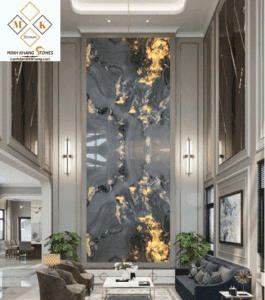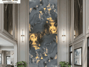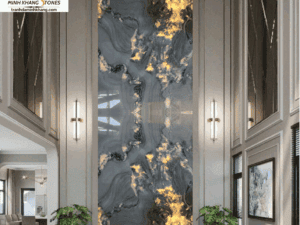 Tông xám trung tính kết hợp cùng vân đá vàng ánh lửa, Tranh đá đối xứng DX53/HT-18/69-18 mang đến cảm giác trầm tĩnh, quyền lực, như linh hồn của núi rừng cổ đại được đánh thức giữa lòng hiện đại.