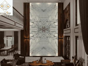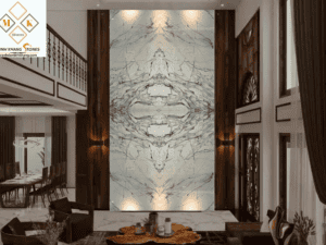 - Hiệu ứng đối xứng gương đầy mê hoặc: Với kích thước ấn tượng 320x320cm, bức tranh là sự kết hợp hoàn hảo của bốn tấm đá nhân tạo cao cấp, được ghép nối tỉ mỉ để tạo nên một hình ảnh phản chiếu kỳ diệu. Sự đối xứng này không chỉ mang đến vẻ đẹp cân bằng, hài hòa mà còn tạo ra một ảo ảnh thị giác độc đáo, thu hút mọi ánh nhìn.