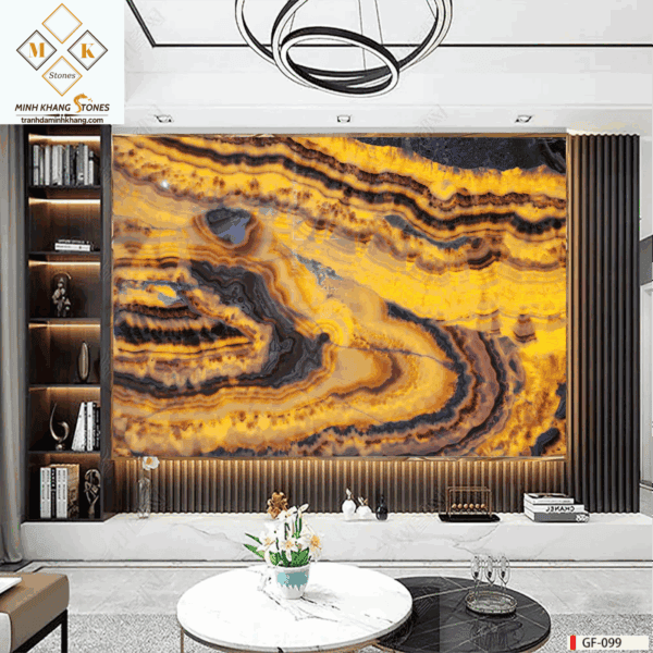 Khi ánh đèn xuyên qua từng lớp đá, Tranh đá Onyx 18/HT-14/69-14 bừng sáng như một mặt trời nhỏ giữa lòng kiến trúc – truyền tải nguồn năng lượng tích cực và ấm áp cho cả căn phòng.