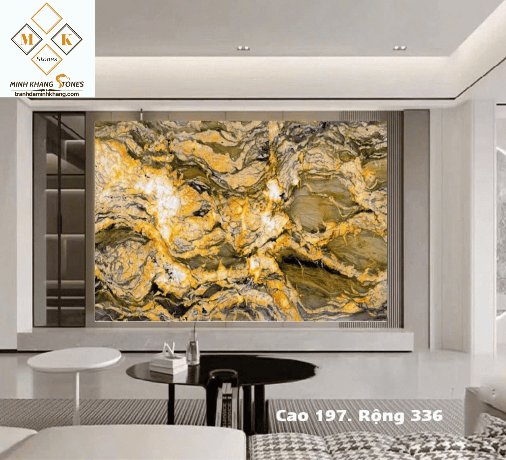 Tranh đá thạch anh TA29/46-01/336×197 gây ấn tượng mạnh với sắc vàng cháy hòa quyện cùng xanh rêu và đen khói.
